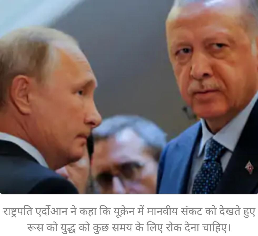 राष्ट्रपति एर्दोआन ने कहा कि यूक्रेन में मानवीय संकट को देखते हुए रूस को युद्ध को कुछ समय के लिए रोक देना चाहिए।