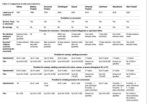 विभिन्न राज्यों में लागू ( 23 दिसंबर 2020) किए गए धर्मांतरण विरोधी कानूनों की तुलना :