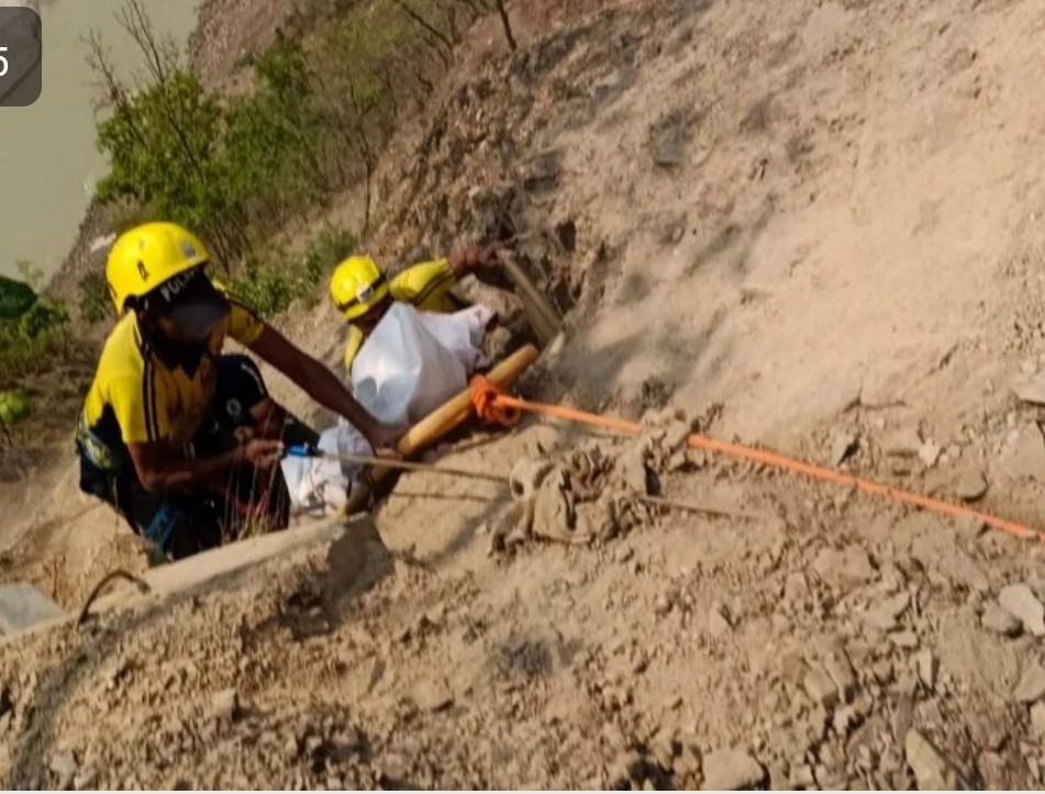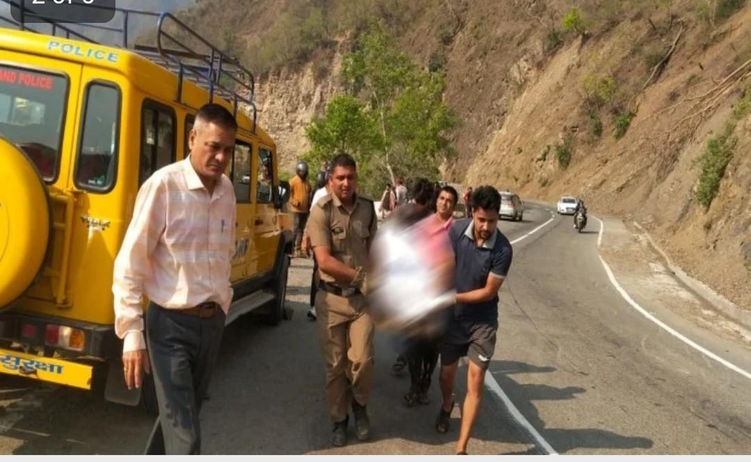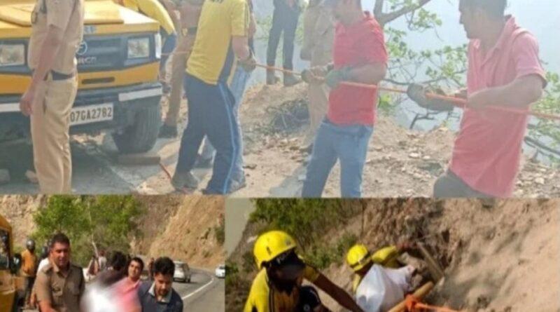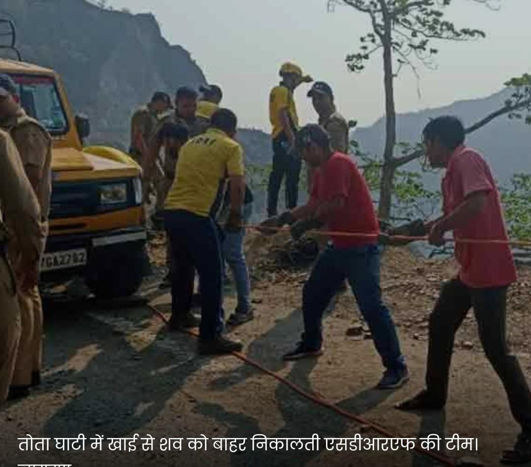 तोता घाटी में खाई से शव को बाहर निकालती एसडीआरएफ की टीम।