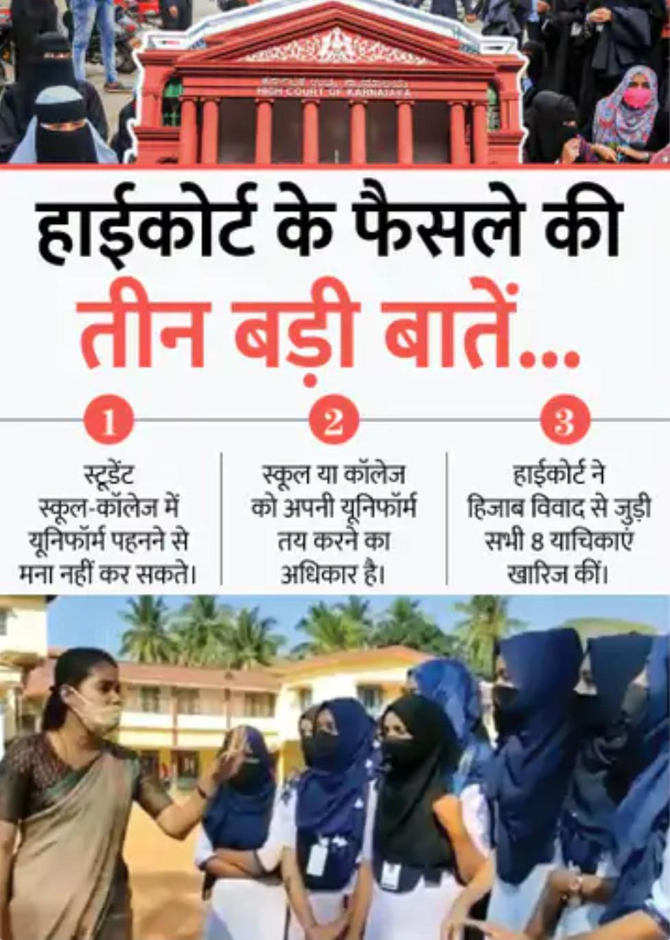 कर्नाटक में हिजाब पर बवाल शुरू होने पर मामला सेशन कोर्ट पहुंचा था। सेशन कोर्ट के बाद केस हाईकोर्ट में गया, जहां इसे बड़ी बेंच को ट्रांसफर कर दिया गया। हाईकोर्ट के चीफ जस्टिस के नेेेेेेतृत्व में तीन मेंबर बेंच ने इस पर सुनवाई शुरू की। आखिरकार 15 मार्च को इस मामले पर फैसला सुनाया गया। हाईकोर्ट ने फैसले के साथ ही इससे जुड़ी 8 याचिकाओं का भी निपटारा कर दिया।